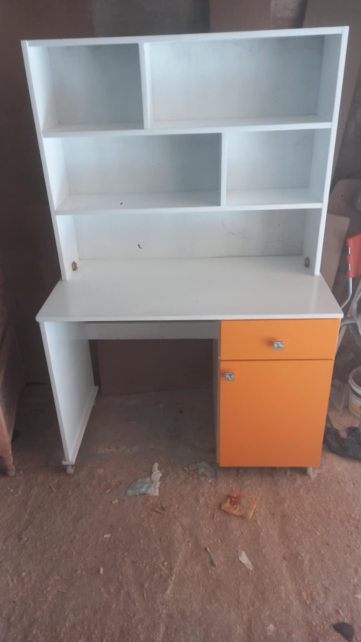 هذا المكتب كان مستعمل من قبل، وتم تجديده بحيث صار ليه تصميم عملي وأنيق. الآن متوفر للبيع، بألوان بيضاء وبرتقالية، مع رفوف متعددة ودرج واحد. مثالي للي يدوروا على مكتب متين ومريح للعمل أو الدراسة!