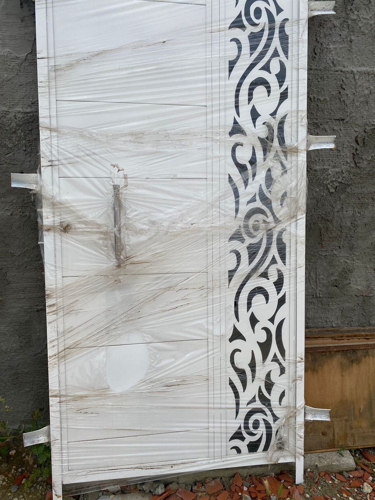 هذي الباب كانت مستعملة من قبل، وتم تجديدها بحيث صار ليه تصميم أنيق ومميز. الآن متوفرة للبيع، بلون أبيض مع نقوش سوداء مزخرفة على الجانب، ومقبض معدني قوي. مثالية للي يدوروا على باب متين بأسلوب عصري وفريد!